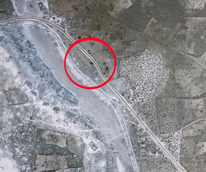 Just to prove to you that this story is not made up, I have located the spot on Google satellite images and marked it for you. You can clearly see the road making a bend around the big dark tree.