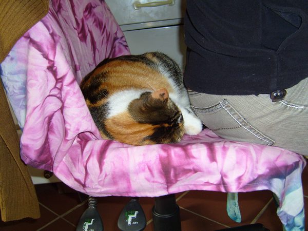 Back-up support and sharp nails to keep me going while I am busy working at the computer. (Yes, that is my bum on the tiny front part of my chair, while she is doing the back-up purring on the main part of the office chair.)