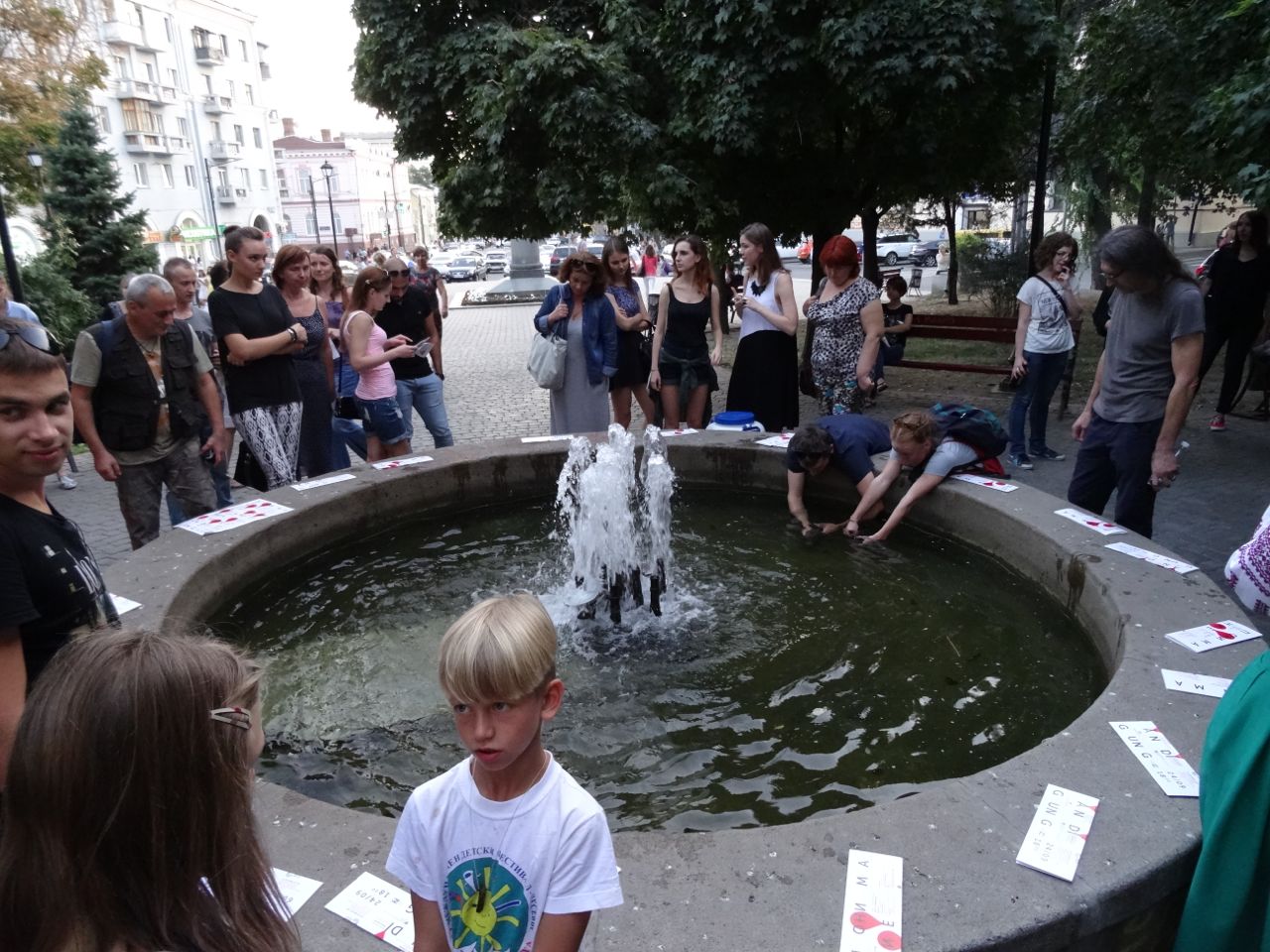 DSC00341 ← Previous Next → Vitaliy Kokhan’s performance, releasing fish which can usually only be afforded by the rich into the public pond.