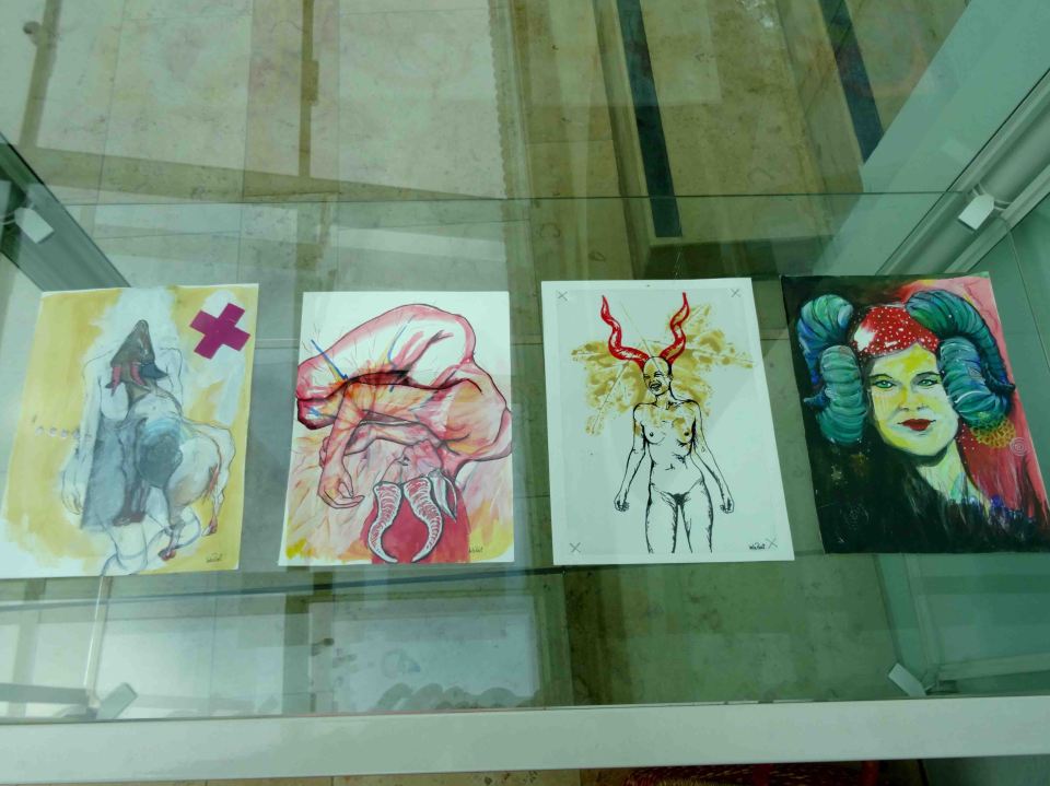 IRust_Orangerie3 ← Previous Next → Mixed Media wWorks on paper: f.l.t.r.: o.T. (Ziege), o.T. (Frau mit Springbockhörnern, o.T. (Frau mit Kuduhörnern), o.T. (Portrait mit Widderhörnern)