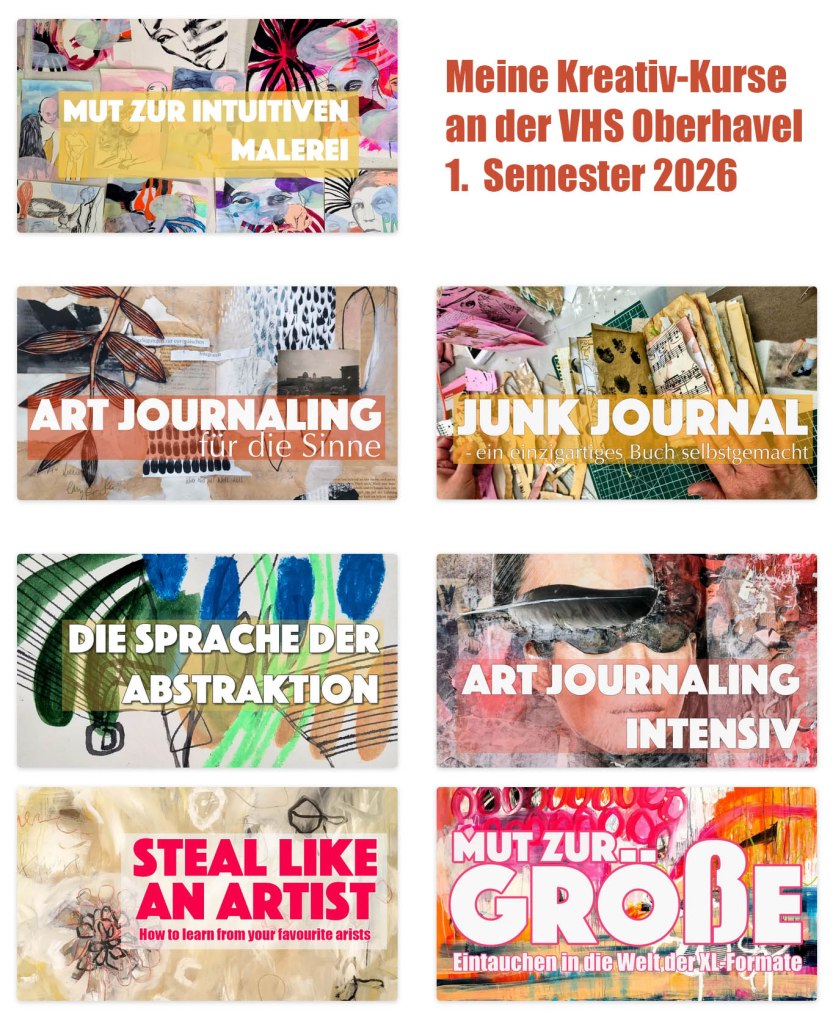 Wenn du dich im kommenden Jahr (wieder) mit mir auf kreative Abenteuer einlassen möchtest, Lust auf Farben, Ausdruck und neue Impulse hast, freue ich mich über deine baldige Anmeldung. Sag es auch gern weiter – oder buche gemeinsam mit einem lieben Menschen. Zusammen macht es oft noch mehr Freude.