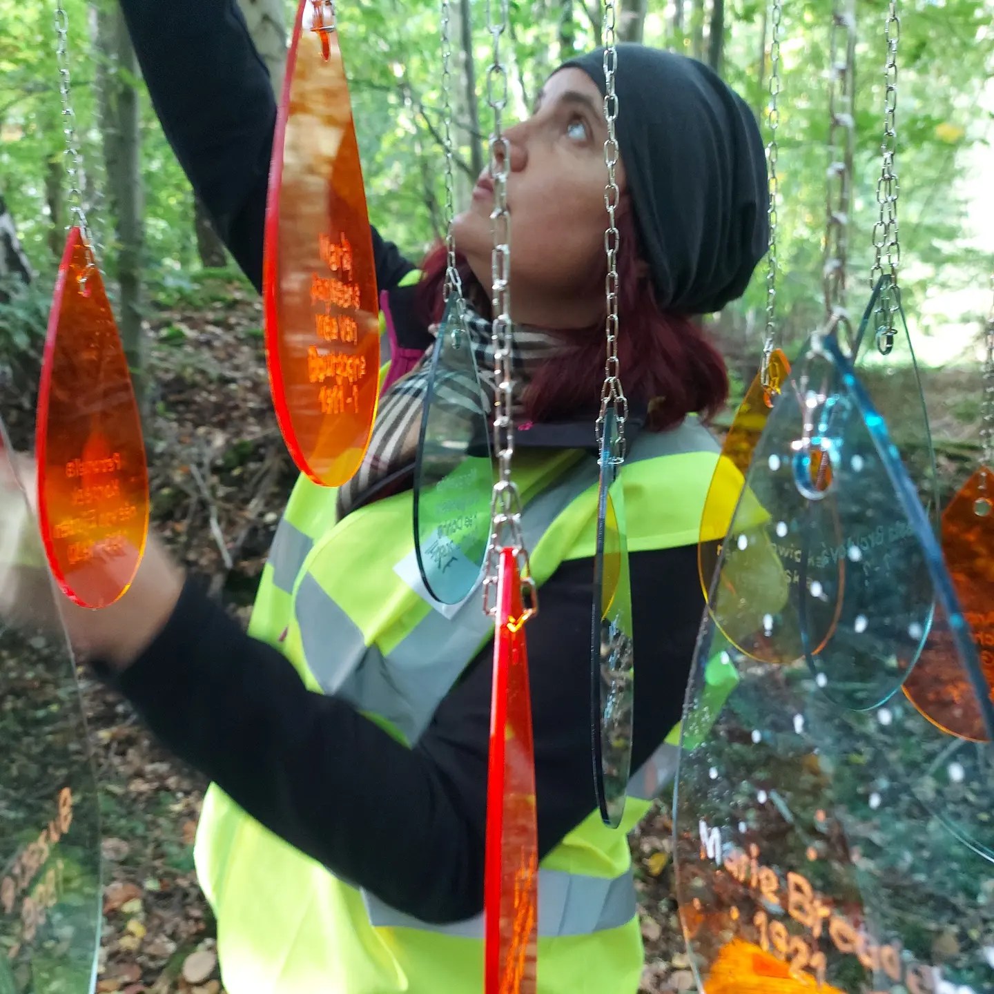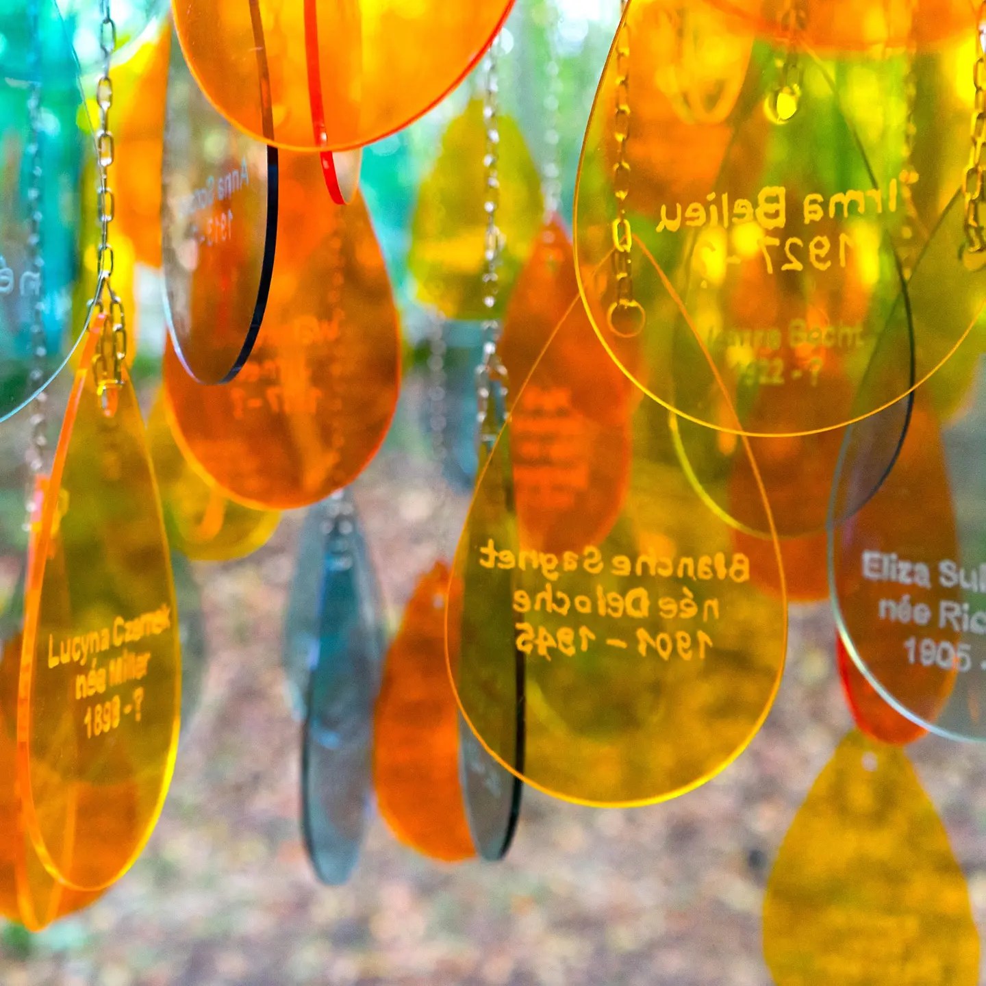Die aus drei Stahlgestellen gebaute Installation erinnert an die Namen und die Biographien von bekannten KZ-Insassinnen des Waldbaulagers und visualisiert diese über schwebende und leuchtend bunte Acrylglastropfen.