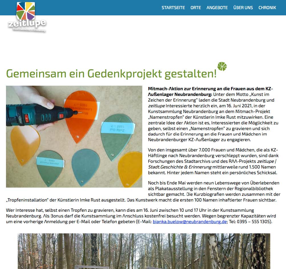 In den vergangenen Monaten veranstalteten die Stadt, unter Leitung ihrer Beauftragten für den Gedenkstättenbereich, Bianka Bülow, und das Team von zeitlupe mit Schüler*innen der Neubrandenburger Schulen und anderen Bewohner*innen der Stadt Workshops, in denen die Teilnehmenden Namenstropfen gravierten, sich mit den Biographien von Gefangenen des Lagers beschäftigten und an ihnen Fragen der eigenen Herkunft und Identitätsbildung bearbeiteten.