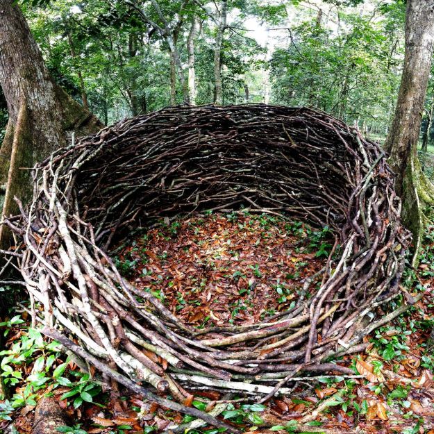 This work offers a calm and protective nest in the forest, to contemplate the cycles of life and death. Made from dead branches, collected in the forest, the work connects three trees. A young and thin tree to the right of the ‘entrance’, where the circle is the lowest, a tall and strong tree on the left and a dead tree on the right.