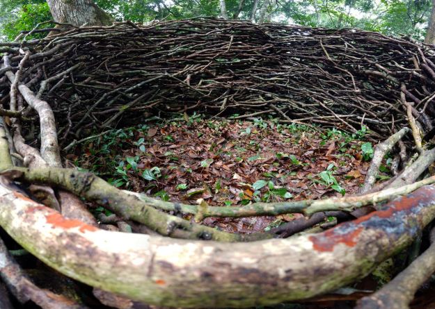 A big nest created out of branches, placed between a small, young tree at the entrance, a tall, strong tree on the left side and an old, dead tree on the right side.