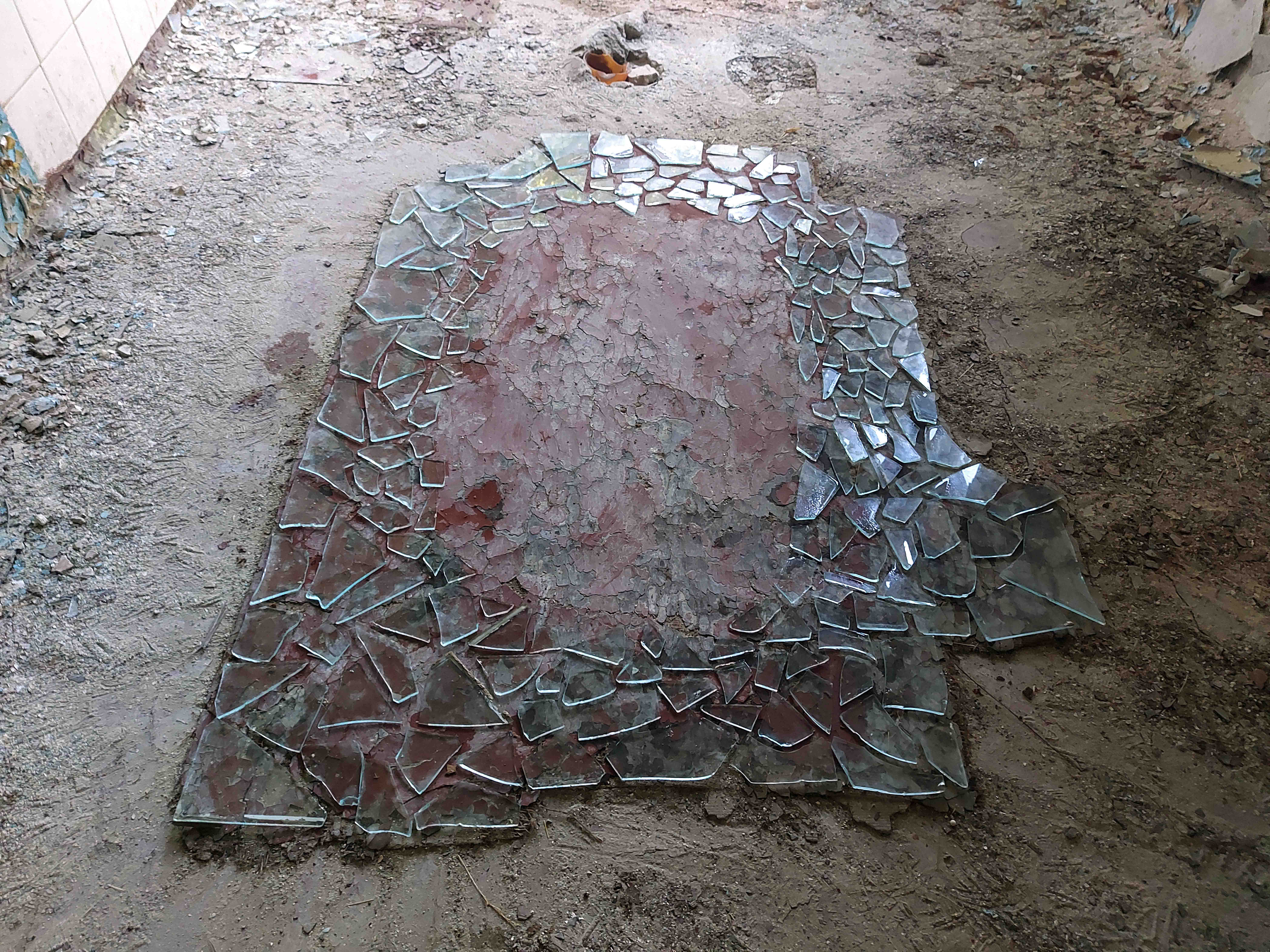 The cleaned glass pieces were then arranged over a found fragment of old, broken linoleum—as if tending to a wound, covering and protecting it from further harm.