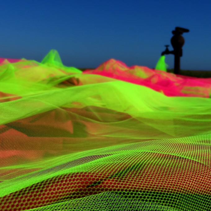 Original dimensions: 80 x 250 x 1400 cm Neon coloured tulle, old tap