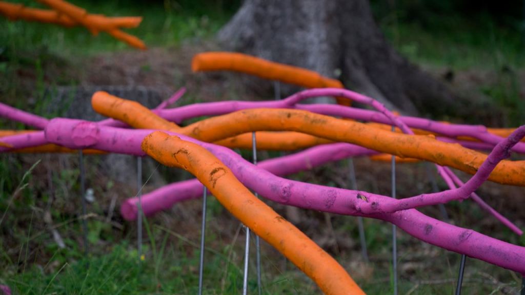 69 Branches, Forestry paint, steel, about 55m long, 2022