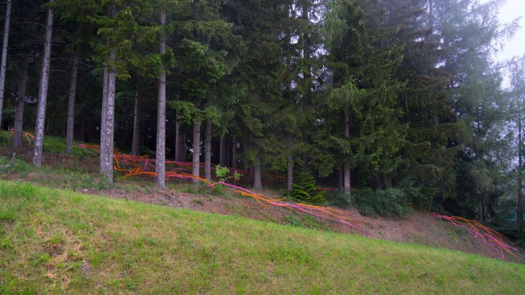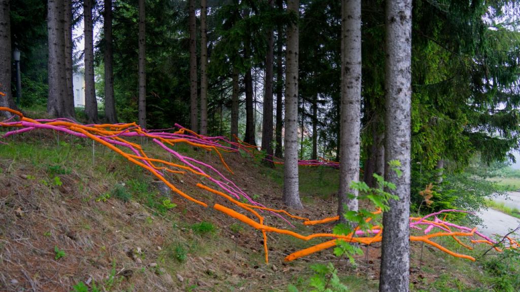 An energy stream of electrifying branches winds its way down the slope of the Waldkunstpark. With colours reminiscent of the glitter of a waterfall at sunset, it symbolises the reciprocal influence between man and the rest of nature. Situated on the slope of the Wechsel (German for change), where the weather currents change, it also points to the current times. The world and humanity (and our perception of it) are shaking and changing drastically.