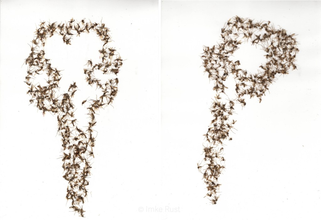 Other works open a broader horizon. The imagined “x-ray scans,” forming skull-like anatomies from countless mosquito bodies, evoke something archetypal and mythic — as if these insects were more than mere pests, but carriers of a deeper, almost universal presence. In Mosquito Constellation, the artist maps the bites on her own skin into the outline of a celestial figure, transforming traces of pain into a cartography of something larger — a reminder that even injury belongs to the same web that connects all living things.
