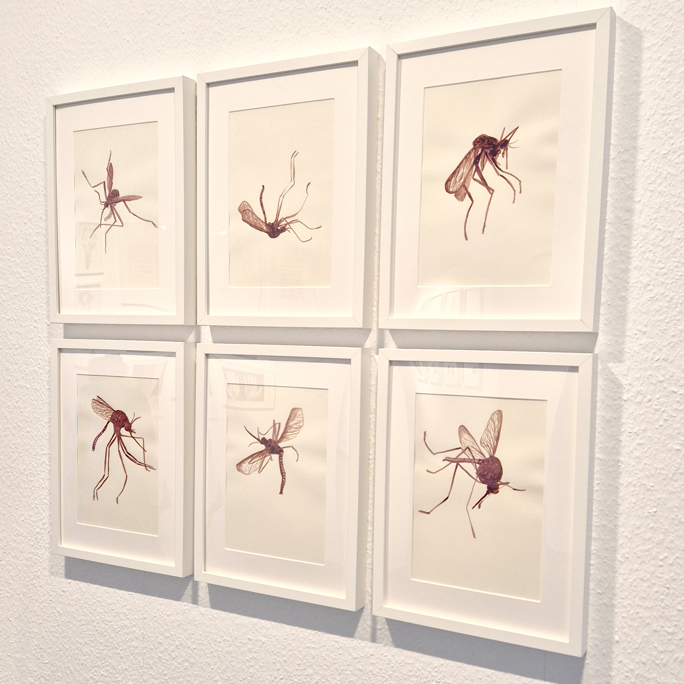 The Mosquito Collection, with the insects lined up meticulously on strips of tape, recalls both a natural history archive and a forensic investigation. Yet beneath the strict order lies another truth: a quiet acknowledgment of the ambivalence between protection and destruction, between action and guilt. Each preserved mosquito is not merely a remnant but a testament to that contradictory tension of closeness and rejection.