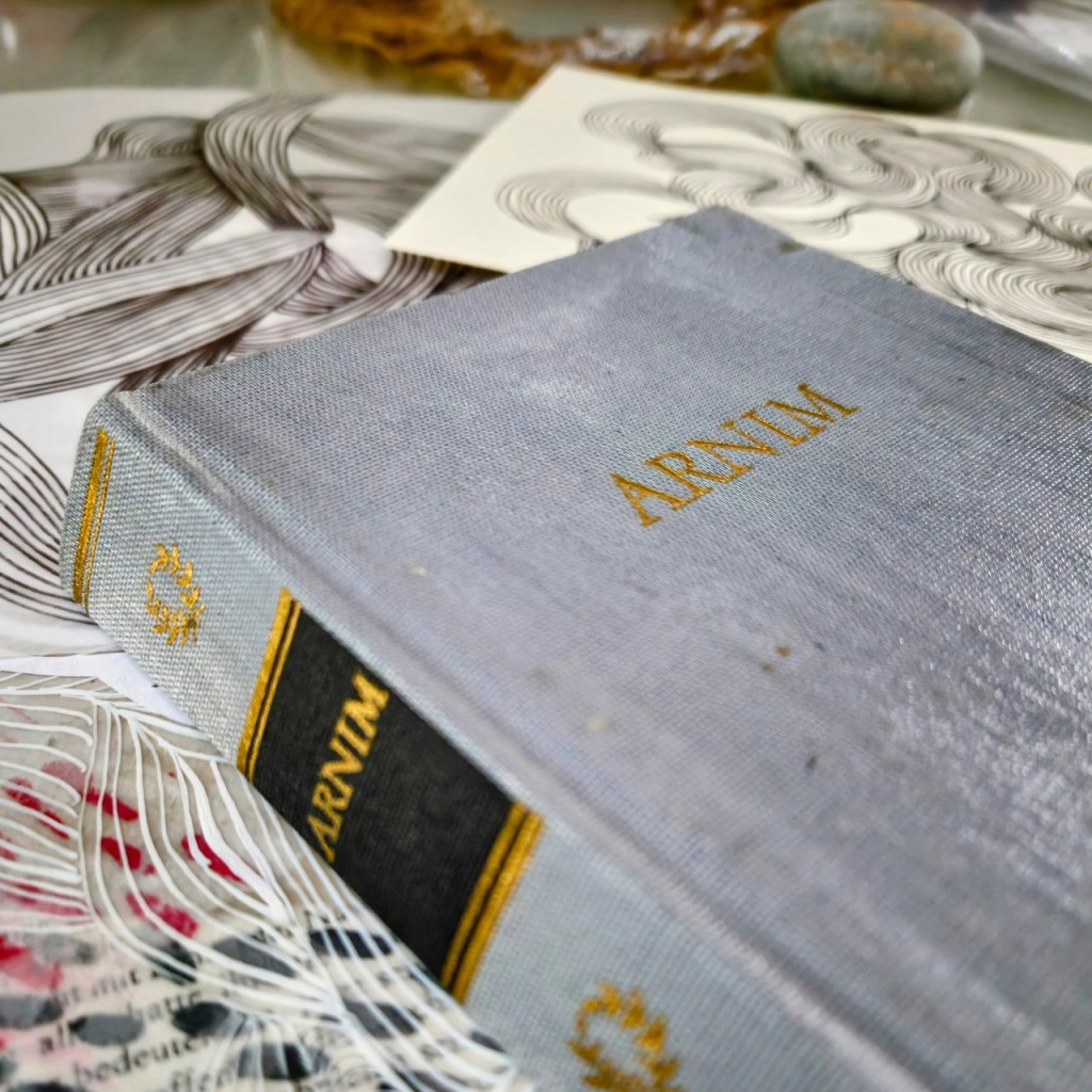 Eight artists came together from all walks of life. Working side by side, together, with and in this wonderful place full of history and exciting personalities. Sometimes we flow, sometimes we wrestle. Knotting, layering and weaving our thoughts, ideas and our creative being anew every day. I take the recently found book I brought with me with works by Achim von Arnim. It forms the basis and bridge to draw these paths, to connect the traces, to interweave and depict history and stories anew.