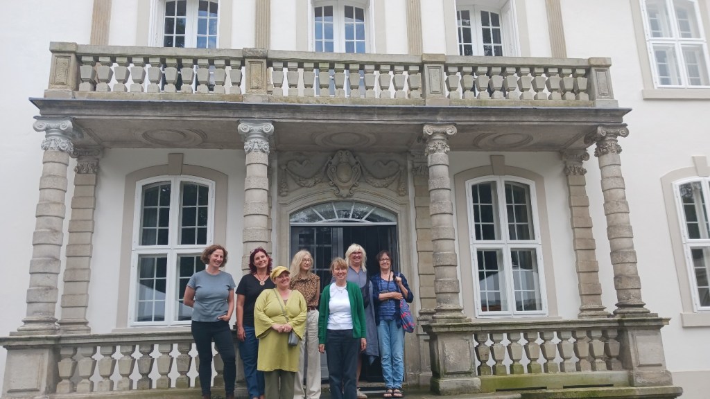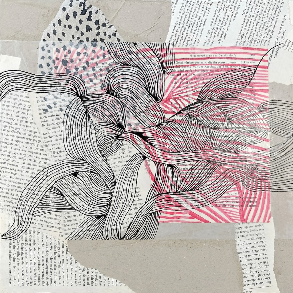 (English below) Acht Künstlerinnen treffen zusammen, aus allen Richtungen und Lebenslagen. Arbeiten parallel nebeneinander, miteinander, mit und in diesem wunderbaren Ort voller Geschichte und spannenden Persönlichkeiten. Mal fließen, mal ringen wir. Verknoten, Schichten und Flechten unsere Gedanken, Ideen, sowie unser kreatives Sein jeden Tag aufs Neue. Das mitgebrachte, kürzlich gefundene Buch mit Werken von Achim von Arnim nehme ich als Basis und Brücke diese Verläufe zu zeichnen, die Spuren zu verbinden, Geschichte und Geschichten neu zu verweben und darzustellen.