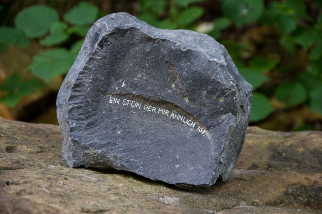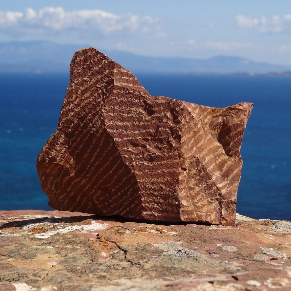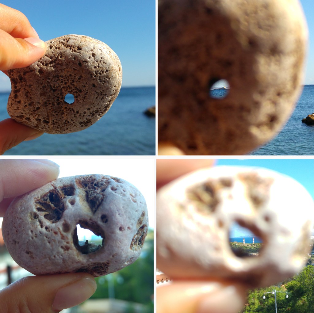 In this photographic series by Imke Rust, stones natural marks or lines are held up so that their markings align precisely with lines in the surrounding environment — a horizon, an edge, a wave, or a distant structure.