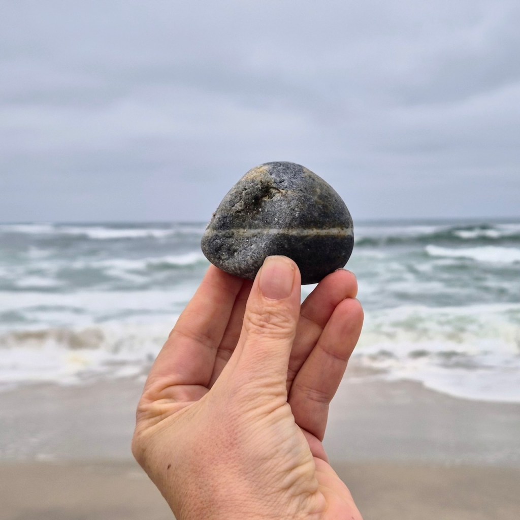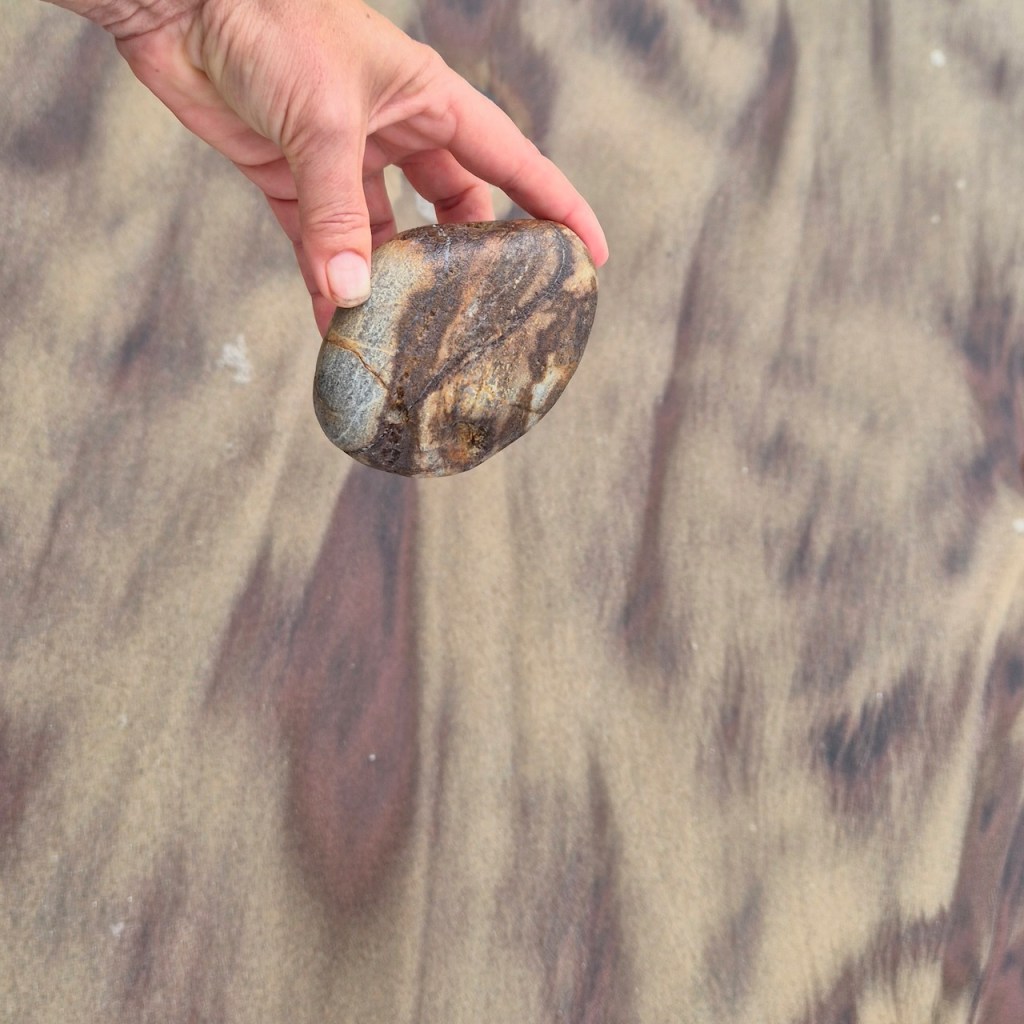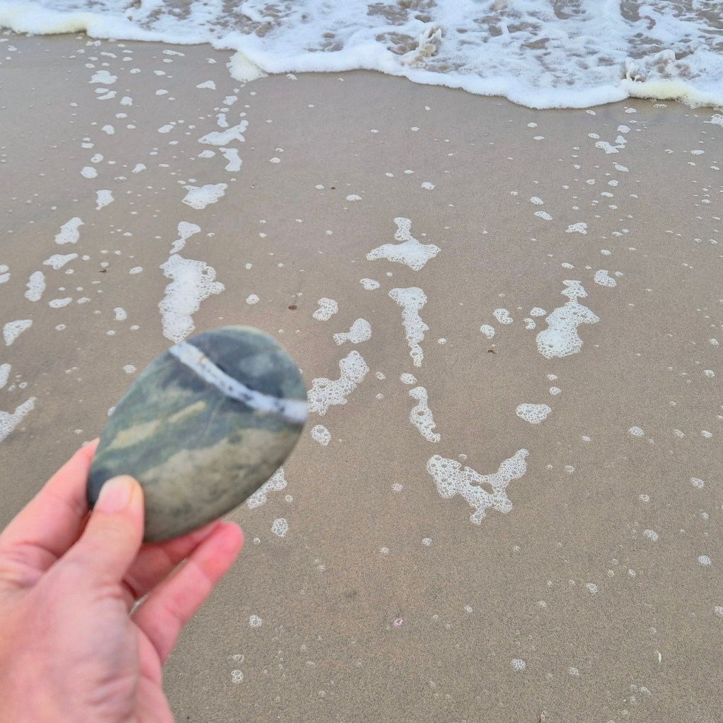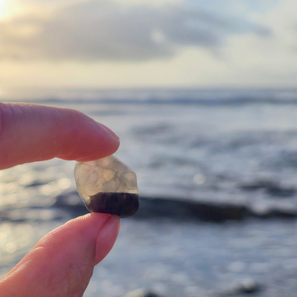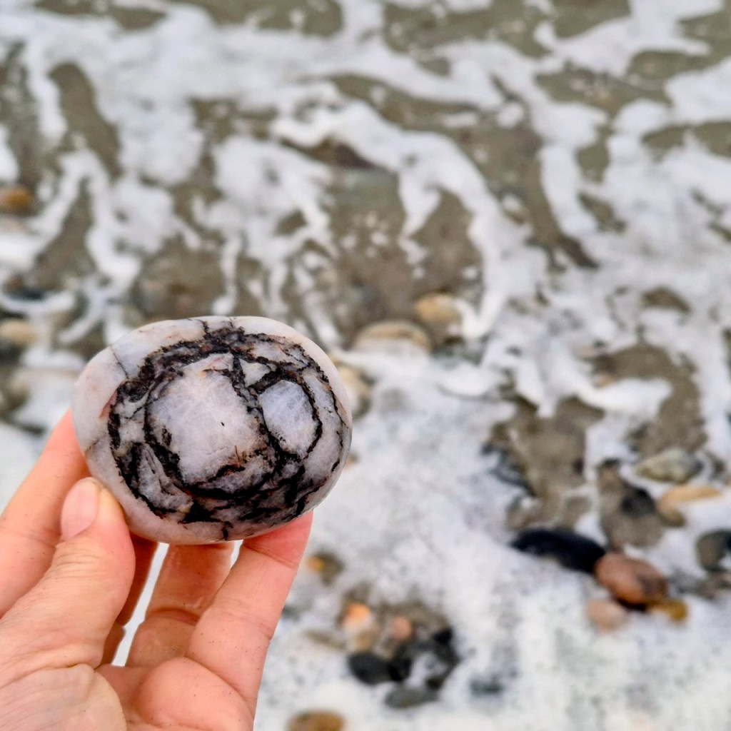 I was fascinated by the wave-like white line and wanted to photograph it. When I held it up, I noticed the white waves in the background and decided to try an line up the stone line with the wave lines… and so this series was born.