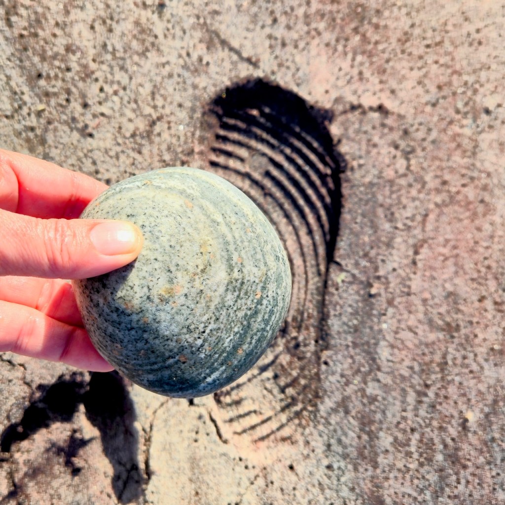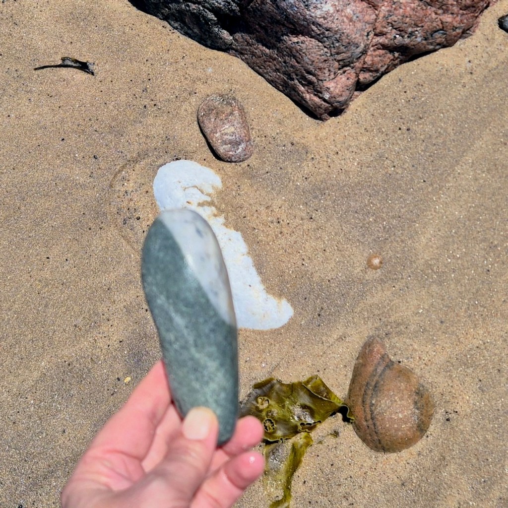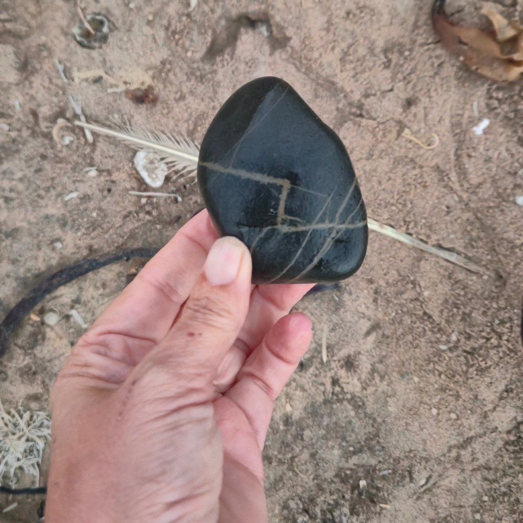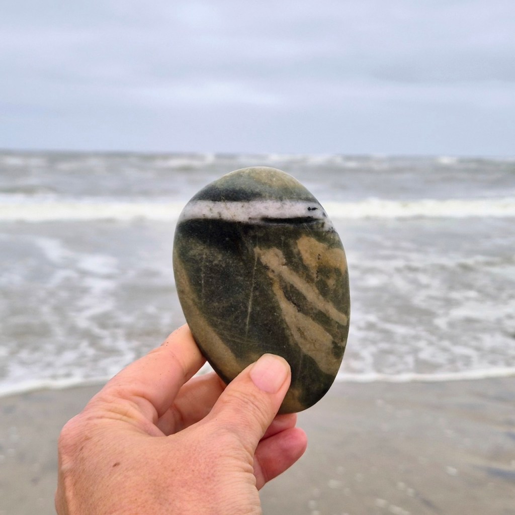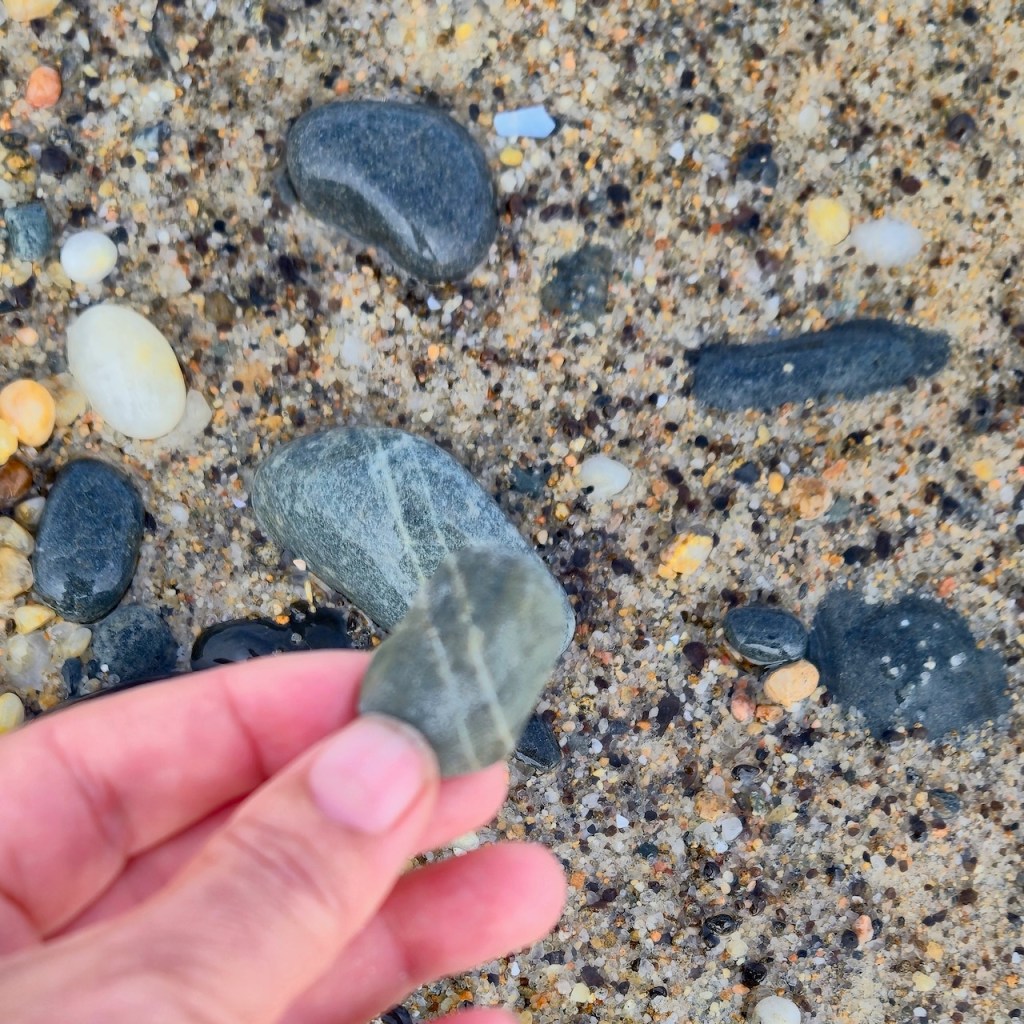 I was fascinated by the wave-like white line and wanted to photograph it. When I held it up, I noticed the white waves in the background and decided to try an line up the stone line with the wave lines… and so this series was born.
