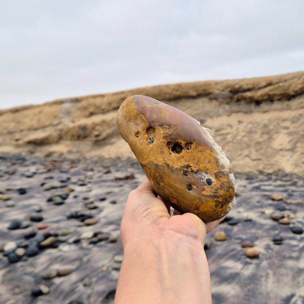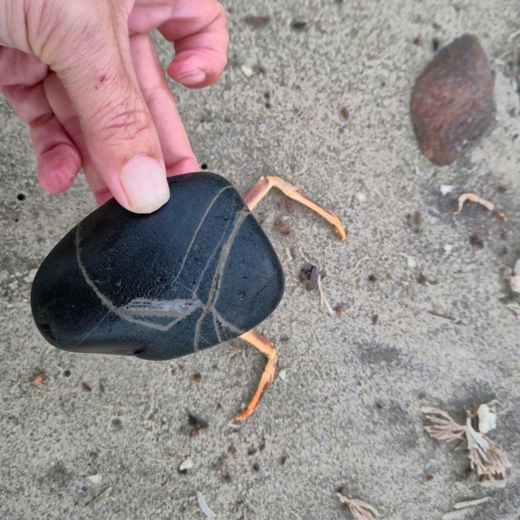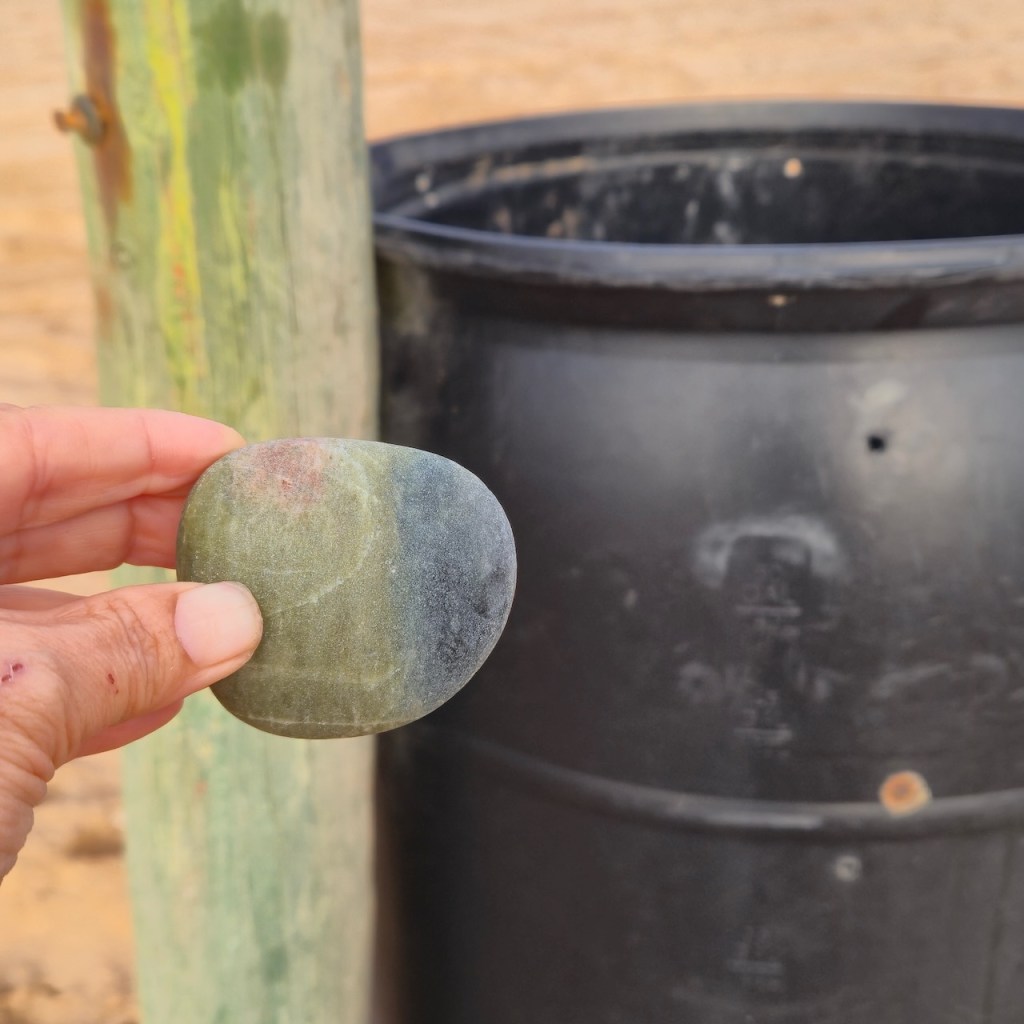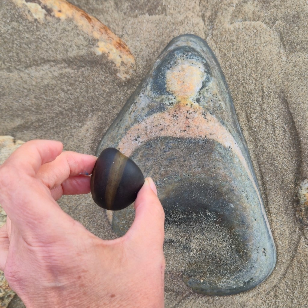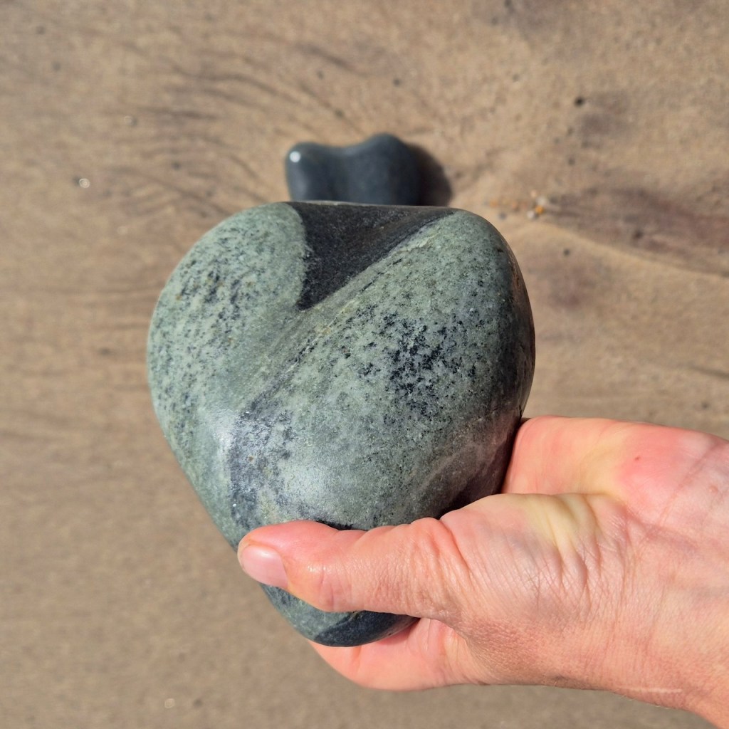 I was fascinated by the wave-like white line and wanted to photograph it. When I held it up, I noticed the white waves in the background and decided to try an line up the stone line with the wave lines… and so this series was born.