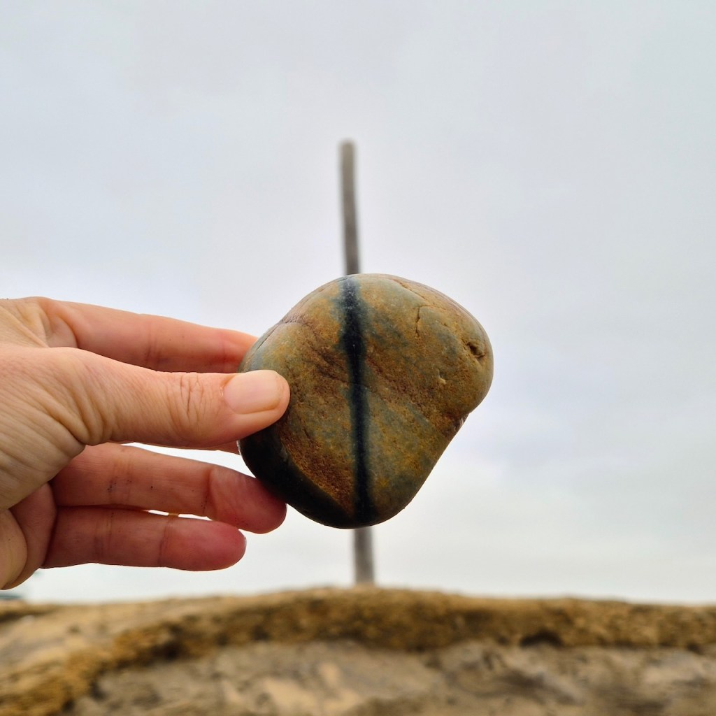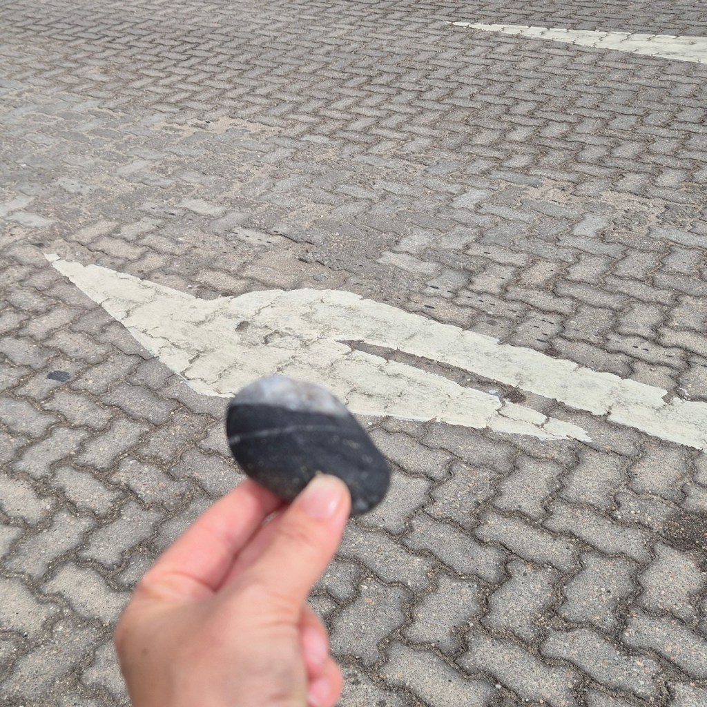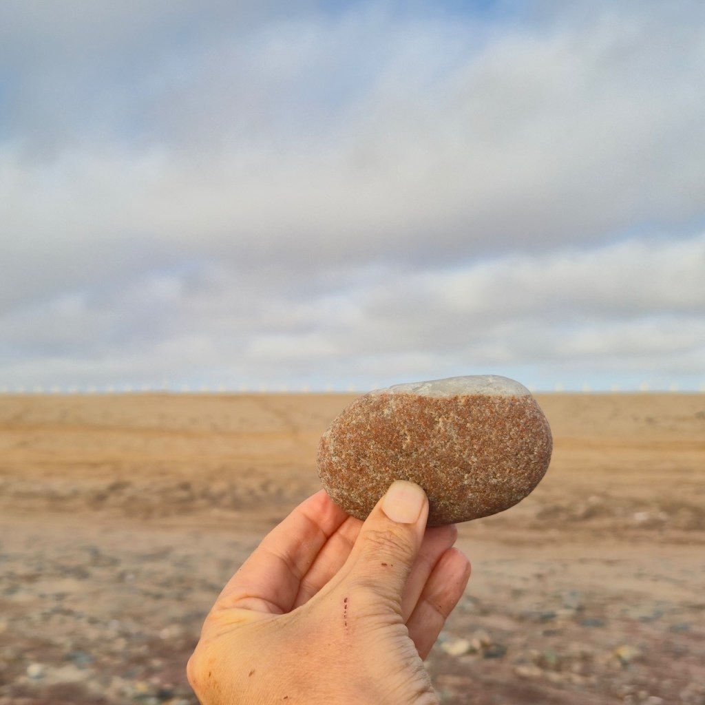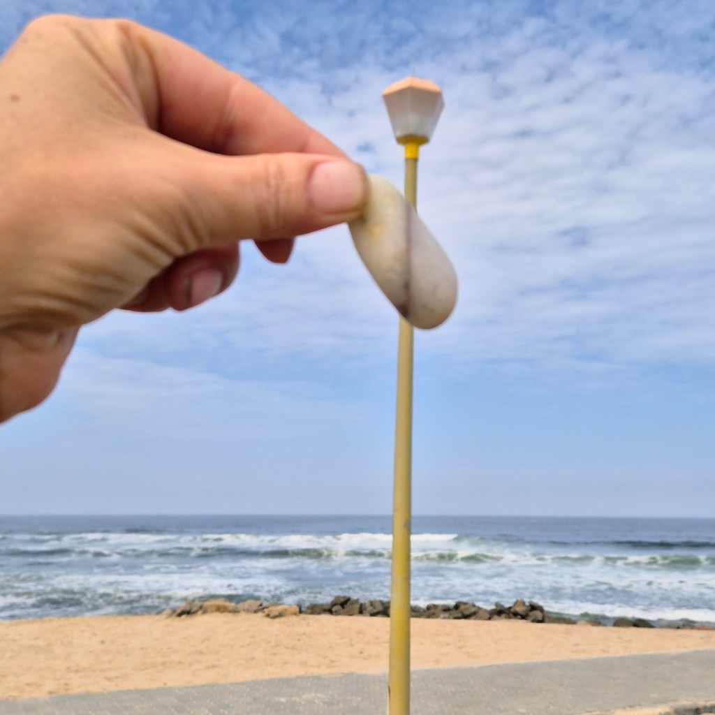 During repeated walks—often along the shoreline—I search for stones marked by natural lines, veins, or fractures. Held in the foreground, these markings are momentarily aligned with structures in the landscape: the horizon, the edge of a wave, color transitions in sand, architectural lines, or other geological formations. Through small adjustments of the hand, unexpected visual continuities appear between the stone and its surroundings.