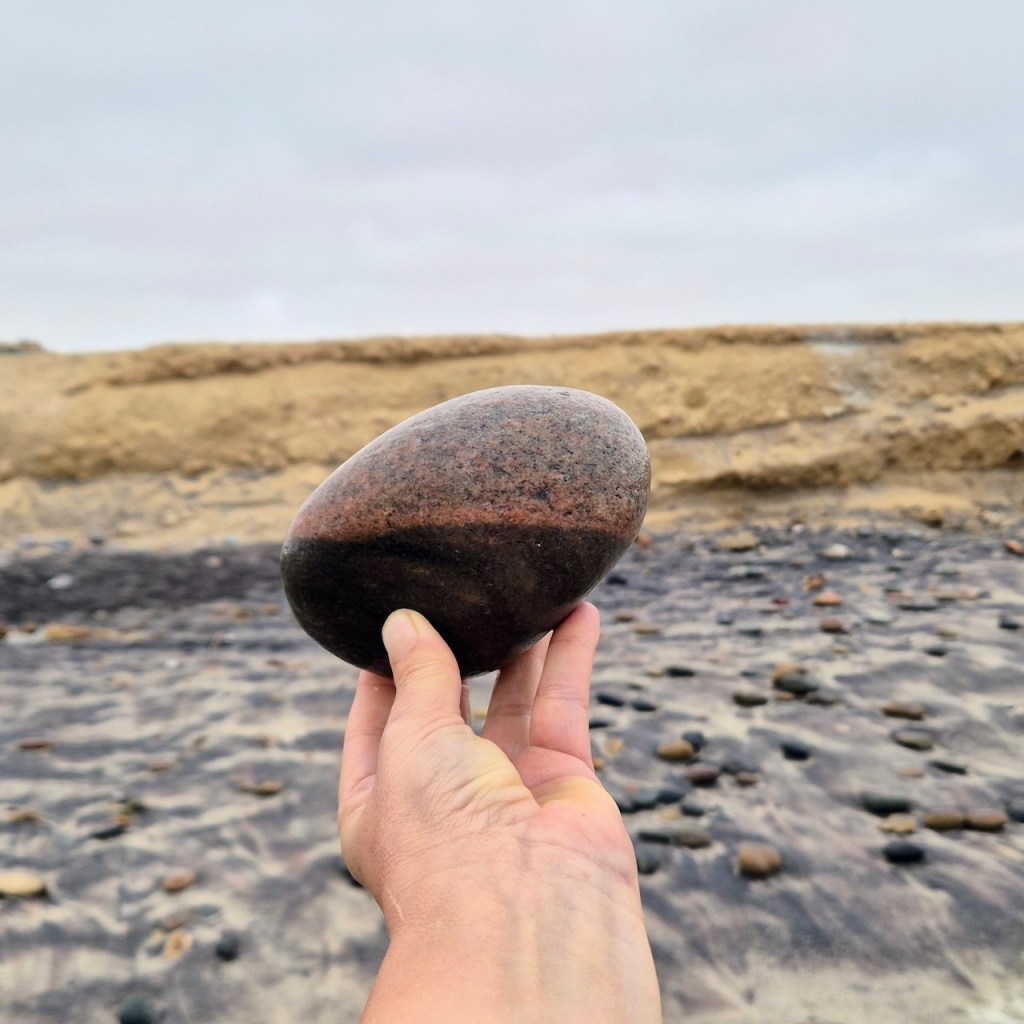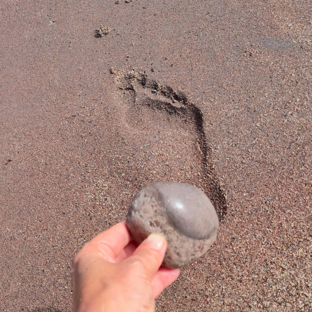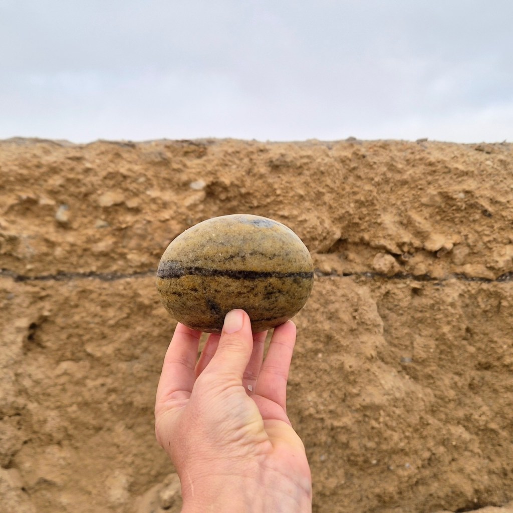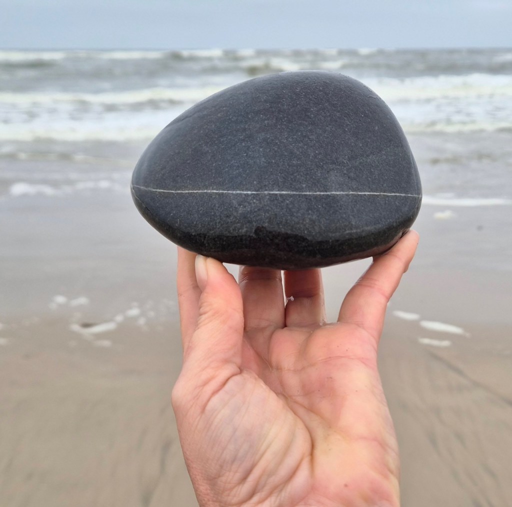 During repeated walks—often along the shoreline—I search for stones marked by natural lines, veins, or fractures. Held in the foreground, these markings are momentarily aligned with structures in the landscape: the horizon, the edge of a wave, color transitions in sand, architectural lines, or other geological formations. Through small adjustments of the hand, unexpected visual continuities appear between the stone and its surroundings.