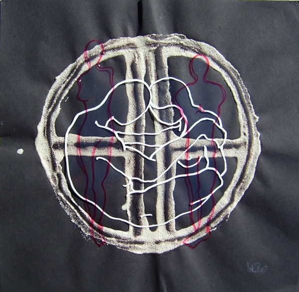 Cross Circle ← Previous Next → Cross Circle by Imke Rust (c) Medium: Maize flour, acetate, tippex, marker-pen and thread on black paper Size: 36x36cm