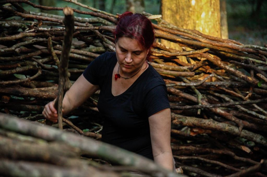 So entstand langsam ein nestähnlicher Kreis. Während ich immer mehr Äste einbaute, merkte ich, das der Kreis zwischen den Wurzeln zweier großen Bäumen war. Außerdem stand ein kleiner Baum am sich entwickelnden Eingang zu dem Kreis oder Nest. Und mir wurde klar, dass einer der großen, starken Bäume eigentlich tot war.