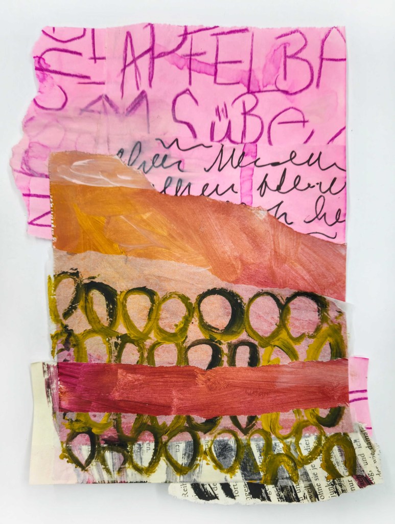 Für dich steht eine Fülle spannender Materialien bereit: Papiere mit besonderen Texturen, Farben, Fäden, Fundstücke … und trotzdem darfst du gerne eigene Schätze mitbringen – Zeitschriften, besondere Papiere, Fotos oder kleine Erinnerungsstücke –, um deiner Arbeit eine ganz persönliche Note zu geben.